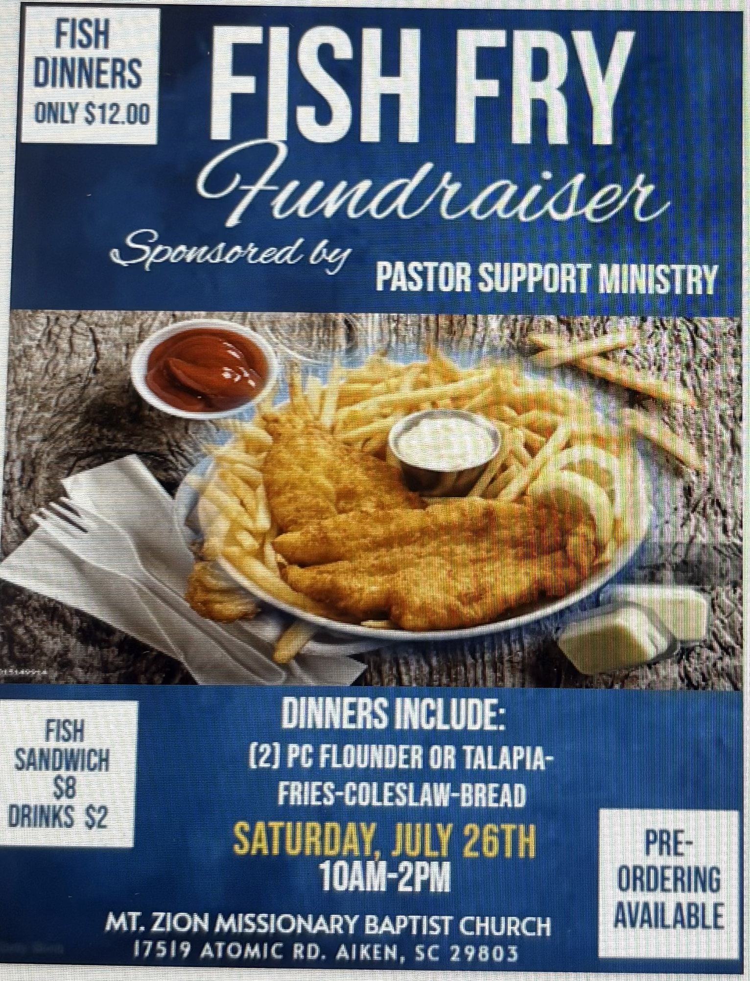 Get your orders in now for the Pastor Support Fish Fry Fundraiser See any member of the Pastor Support Ministry to preorder. Mt. Zion Missionary Baptist Church Saturday - July 26, 2025 10am - 2pm